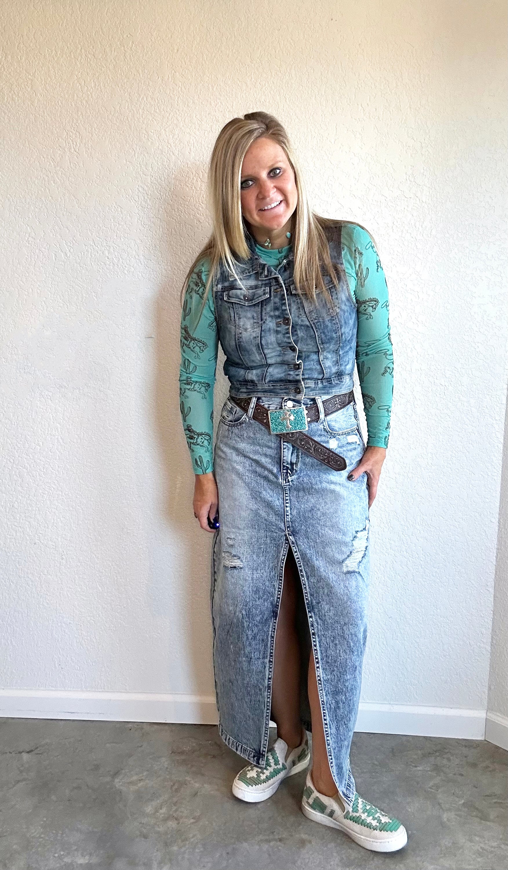 Distressed blue denim skirt. I recommend sizing up as it has no stretch and tighter fit.